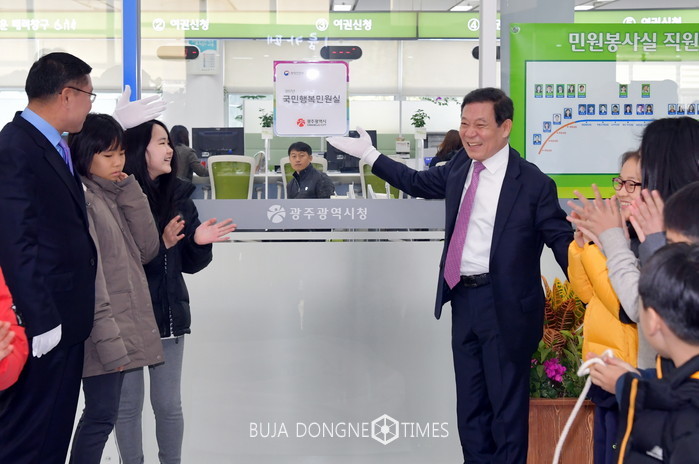 윤장현 시장은 현판 제막식에서 직원들의 노고를 격려하면서 “민원실 입구에 자리한 국민행복민원실 현판은 공무원들에게는 자부심을, 시민들에게는 최고의 서비스를 받을 수 있다는 신뢰감을 가질 수 있게 할 것이다”며 “내년에도 쾌적하고 편안한 시설과 시민들에게 친절과 감동을 주는 ‘시민행복 민원서비스’를 실천하도록 노력하겠다”고 말했다.
