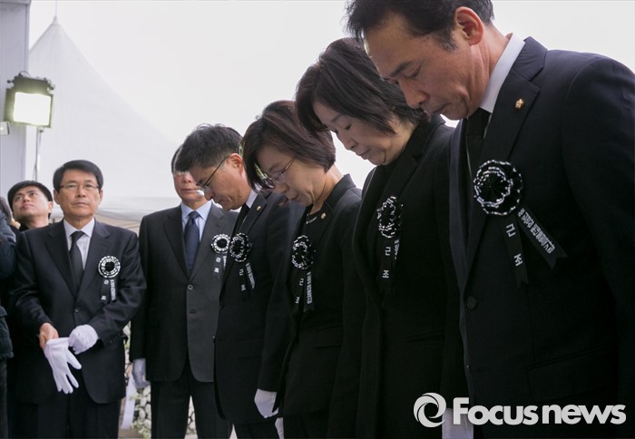 (서울=포커스뉴스) 25일 오후 서울 여의도 국회 본청 앞에 마련된 故 김영삼 전 대통령 국가장 분향소에서 심상정 정의당 대표 등 의원들이 합동 조문을 하고 있다.
