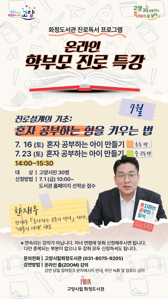 [부자동네타임즈 김인수기자] 고양시 화정도서관이 오는 7월부터 학부모 대상 진로독서 프로그램을 운영한다. 자녀 진로에 관한 궁금증을 해소해주는 다양한 강좌를 줌(ZOOM)을 통한 온라인 강연으로 만나볼 수 있다.
