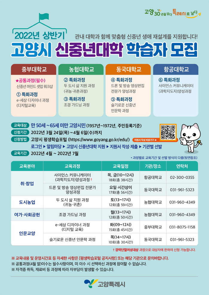 [부자동네타임즈 김인수기자] 고양시가 2022년 고양시 ‘5060 신중년대학’ 상반기 참가자 200명을 3월 24일부터 4월 6일까지 모집한다.