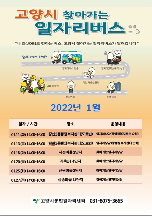 [부자동네타임즈 김인수기자] 고양시 ‘찾아가는 일자리버스’가 2022년 11일 중산2동 행정복지센터를 시작으로 탄현2동 행정복지센터, 서정마을 3단지 등 아파트 단지를 순회 방문한다.
