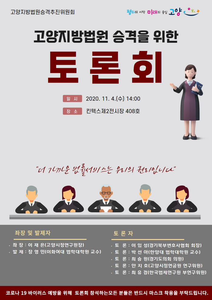 [부자동네타임즈 김인수기자] 고양시는 "오는 11월 4일 14시에 킨텍스 제2전시장 408호에서 ‘고양지방법원 승격 토론회’를 개최한다."고 밝혔다.