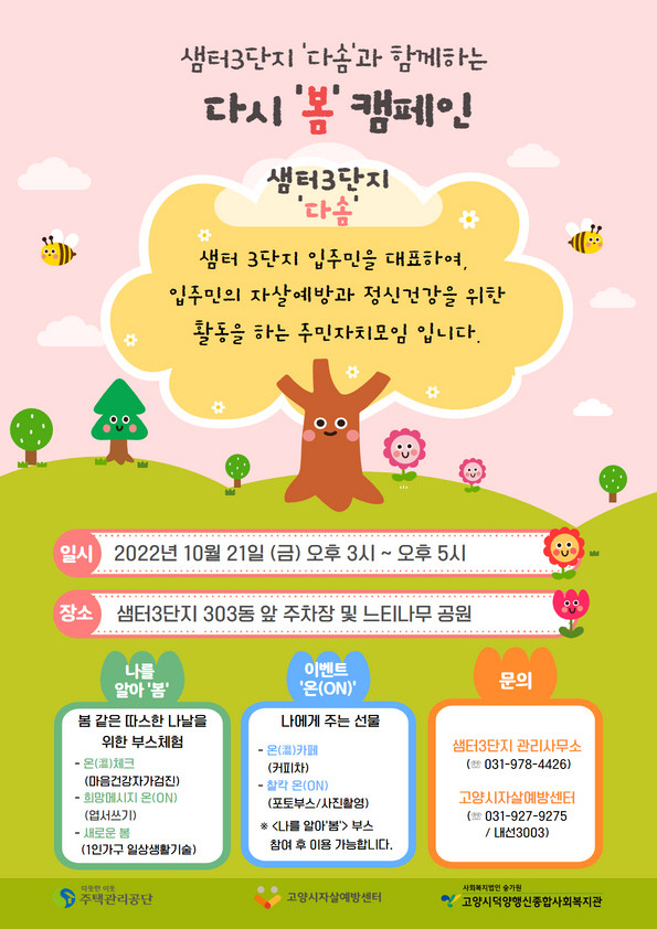 [부자동네타임즈 김인수기자] 고양시자살예방센터가 자살예방에 대한 관심을 높이고, 생명존중문화를 조성하기 위해 유관기관 및 주민활동가와 함께 10월 21일 샘터3단지 아파트 느티나무공원에서 캠페인 ‘다시 봄’을 진행한다.