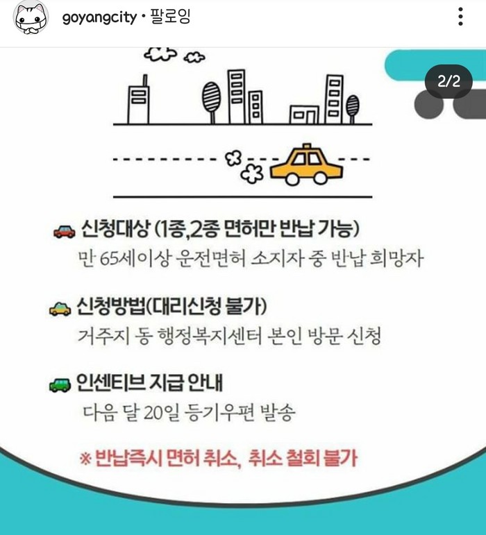 경기도 31개 시·군에서 함께 실시하고 있는 사업으로, 각 시·군에서는 운전면허를 스스로 반납하는 고령운전자에게 지역화폐로 인센티브를 지급하며 참여를 유도하고 있다.