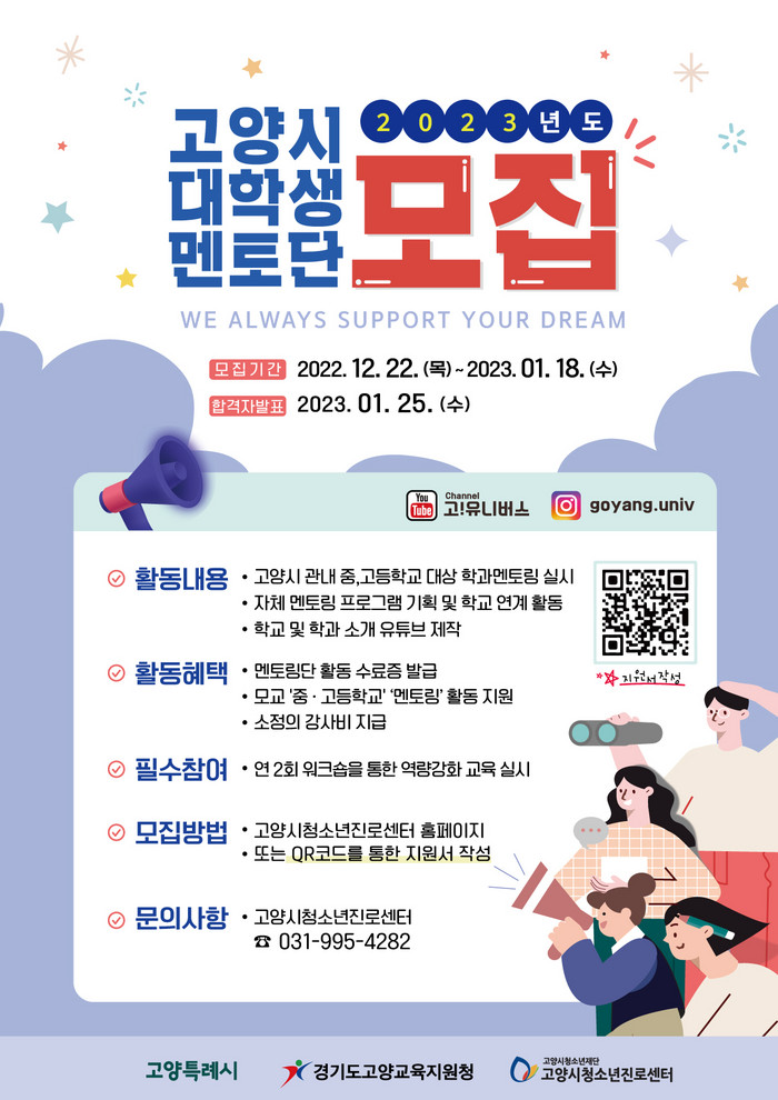 [부자동네타임즈 김인수기자] 고양특례시(시장 이동환) 청소년진로센터가 1월 18일까지 2023년 ‘고양유니브’를 모집한다. 고양유니브는 고양시 중·고등학생들의 학과 선택 및 진로 설계를 돕는 대학생 멘토단이다.