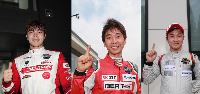 [사진설명] 2019 한중일 슈퍼챌린지에 참가하는 슈퍼 6000 클래스 4라운드 우승자 김동은, GT1 클래스 시즌 챔피언 정경훈, GT2 클래스 시즌 챔피언 박희찬(왼쪽부터)