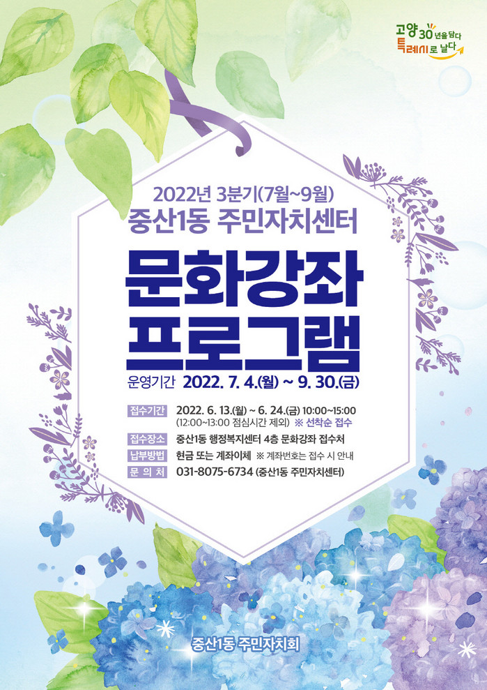 중산1동 주민자치센터 문화강좌 프로그램 접수는 6월 24일까지 매일 오전 10시~오후 3시(12시~1시 제외)에 중산1동 행정복지센터 4층 접수처에서 진행되며, 자세한 내용은 고양시청 홈페이지 내 중산1동 페이지에서 확인 가능하다.