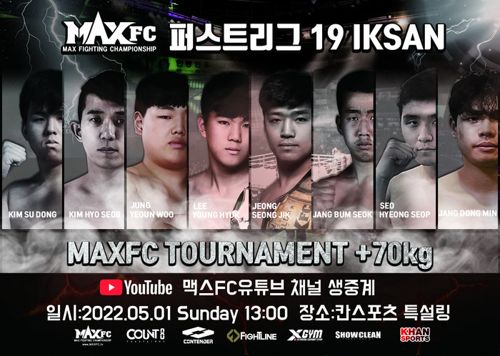 한편 MAXFC ‘퍼스트리그 19 무제한급 원데이 토너먼트’ 대회는 5월 1일 오후 1시 전북 익산 칸스포츠 특설링에서 개최된다. 코로나19로 인해 무관중으로 진행되며, MAXFC 유튜브 채널에서 생중계된다.