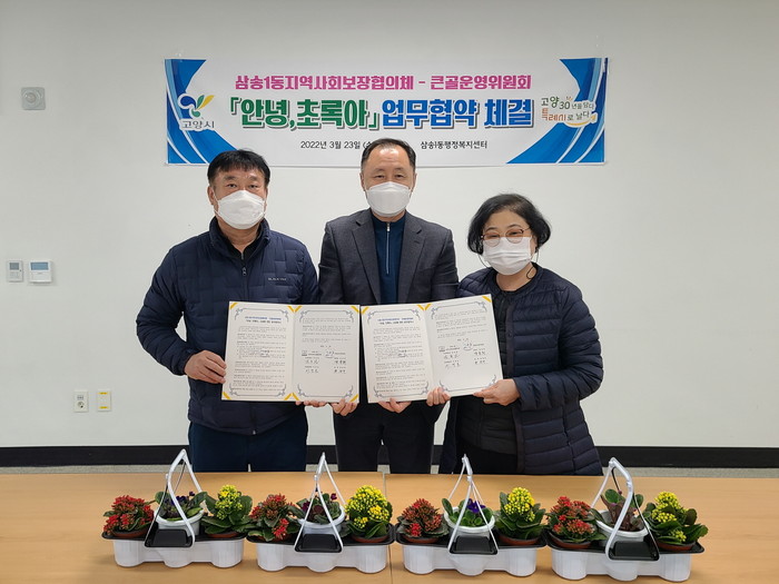 [부자동네타임즈 김인수기자] 고양시 삼송1동행정복지센터(동장 김동원)는 삼송1동지역사회보장협의체(위원장 이경온)와 큰골운영위원회(회장 강윤희)가 홀몸 어르신의 고독사를 방지하고 정서적 만족감을 높일 수 있도록 반려식물을 지원하는 ‘안녕, 초록아’ 업무협약을 23일 체결했다고 밝혔다.