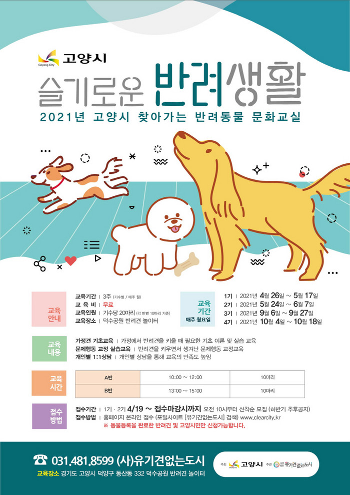 참여 대상은 동물등록을 완료한 반려견과 고양시민이며, 교육 장소는 지난 3월 새롭게 개장한 덕수공원 반려견 놀이터다. 접수는 이달 19일 부터 ‘유기견 없는 도시’ 홈페이지에서 하면 된다. 교육은 선착순 마감이며, 본인의 아파트 단지 내 교육 실시 여부는 관리사무소를 통해 확인하면 된다.