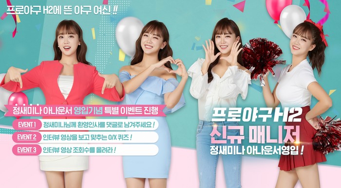 프로야구 H2는 정새미나 아나운서의 인터뷰 영상을 공개했다. 이용자는 매니저 선정 소감, 정새미나의 드림 라인업, 프로야구 H2의 특장점, 랩 실력 등이 담긴 영상을 ‘프로야구 H2 운영 TV’ 유튜브 채널에서 볼 수 있다.