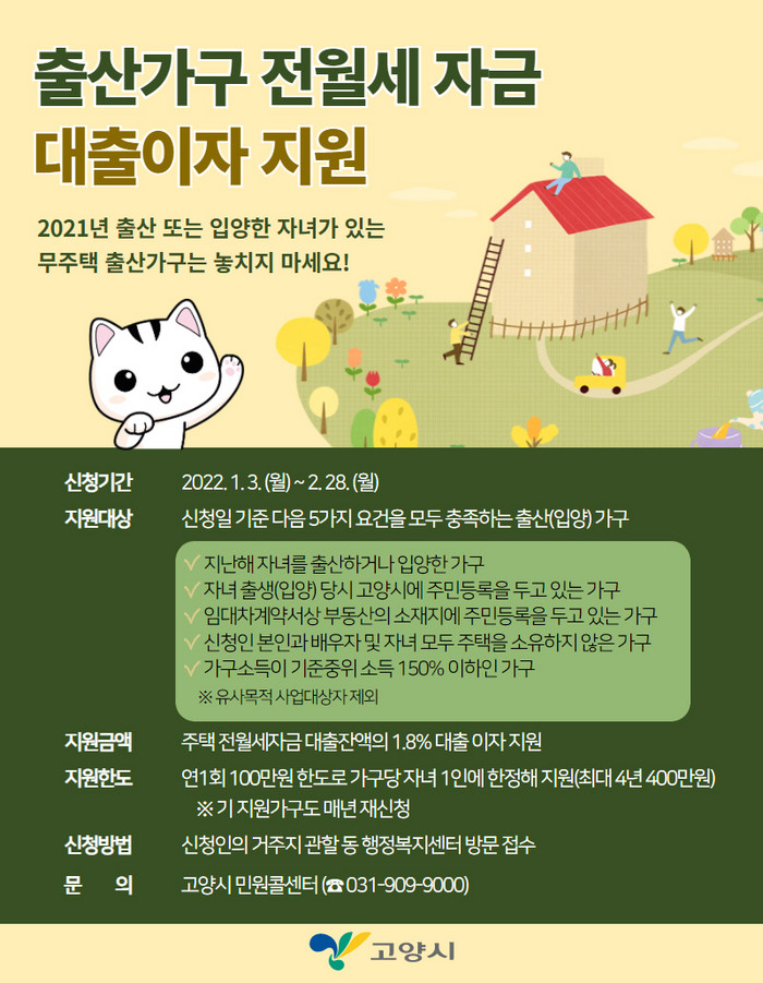 시는 무주택 출산가구의 주거비 부담을 경감하고 안정된 주거환경 조성을 위해 2022년 처음으로 고양시 출산가구 전월세자금 대출이자 지원사업을 시행했다.
