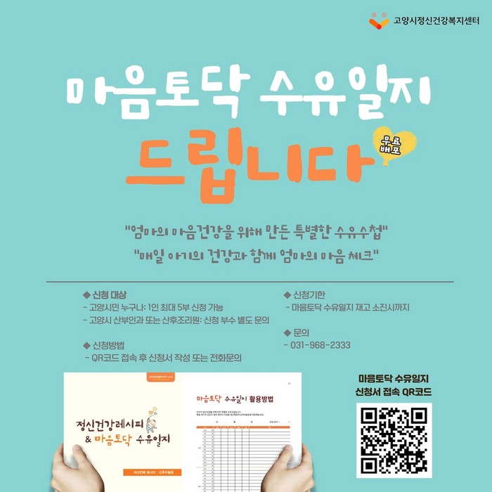 고양시민이면 누구나 마음토닥 수유일지를 받을 수 있으며 보건소 모자보건실, 산후조리원, 산부인과 등에서 신청할 수 있다.