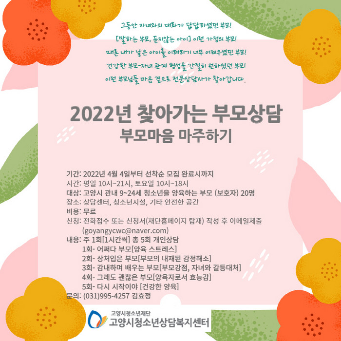 고양시청소년상담복지센터, ‘찾아가는 부모상담’대상자 모집.
