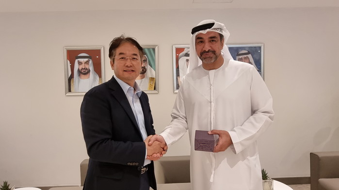 [사진설명] 이동환 고양특례시장과 두바이 세계무역센터 부사장 마히르 아둘카림 줄파가 악수하는 모습.