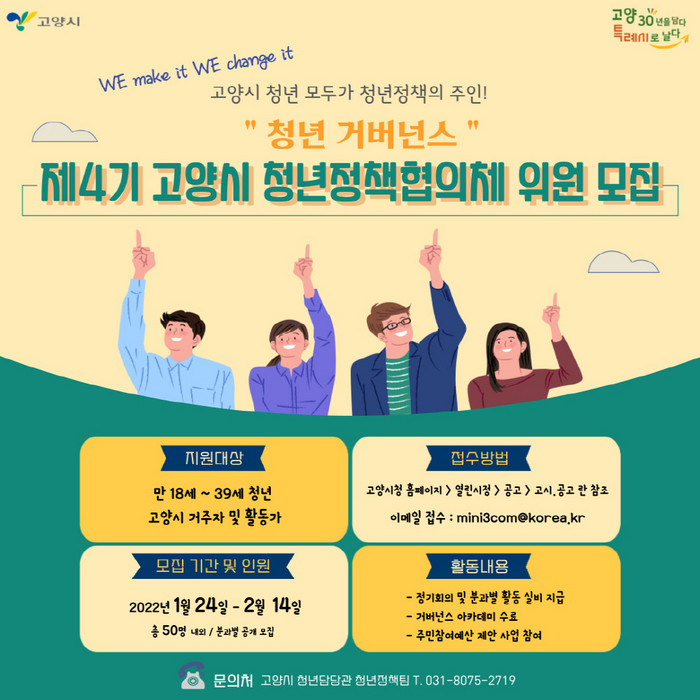 [부자동네타임즈 김인수기자] 고양시가 청년정책의 직접 수혜자이자 주인인 청년들의 정책의제 발굴 및 제안, 모니터링 등을 위한 고양시 청년정책협의체 제4기 위원을 2월 14일(월)까지 모집한다.