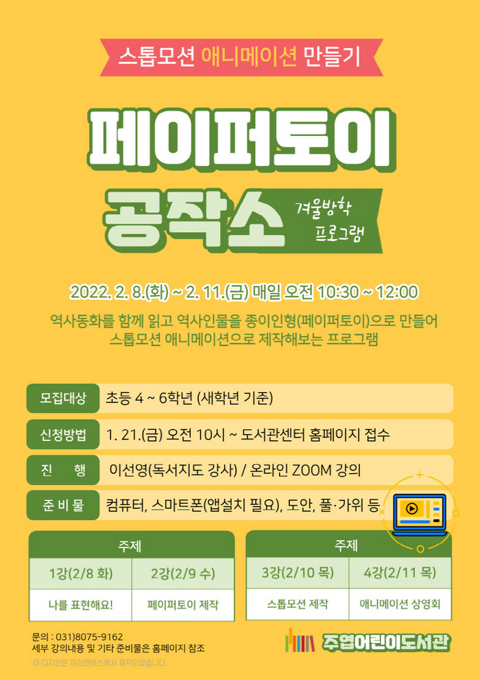 [부자동네타임즈 김인수기자] 고양시 주엽어린이도서관이 겨울방학을 맞은 초등학생을 대상으로 스톱모션 애니메이션 만들기 프로그램 페이퍼토이 공작소를 운영한다.