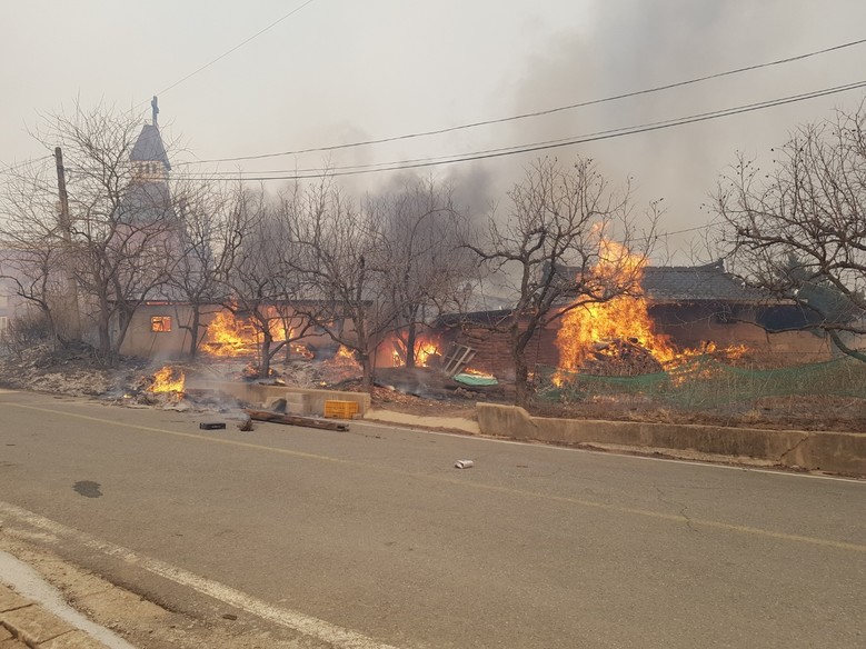 [의성 세계타임즈 = 한윤석 기자] 경북 의성에서 동시다발로 발생한 산불이 민가로까지 번져 피해가 확산하고 있다.