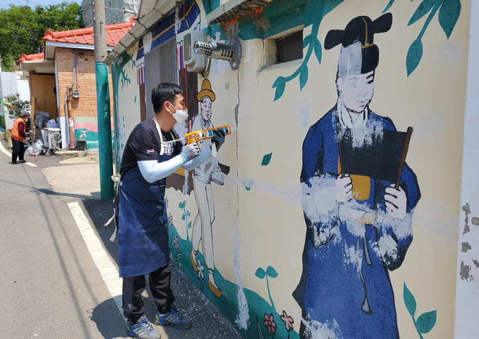 지난 16일부터 시작한 이번 사업은 마을의 오래된 벽화들이 페인트가 벗겨지고, 색채는 바래서 흉물스럽게 변한 모습을 안타깝게 여긴 삼송도시재생 주민협의체 문화경제분과회원 5명이 처음 제안했다.