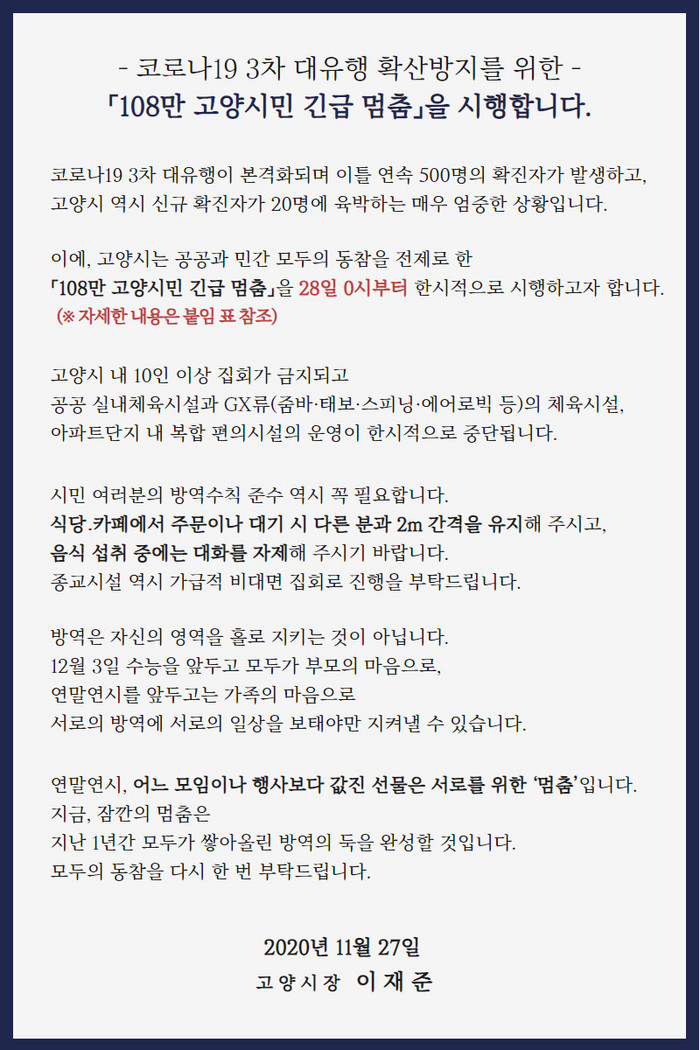 [부자동네타임즈 김인수기자] 국내 확진자가 연일 500명이 넘게 발생하며 고양시가 "11월 28일 0시부터 다음 달 7일 24시까지 10일간 "108만 고양시민 긴급 멈춤" 고양형 방역강화 조치를 실시한다."고 밝혔다.
