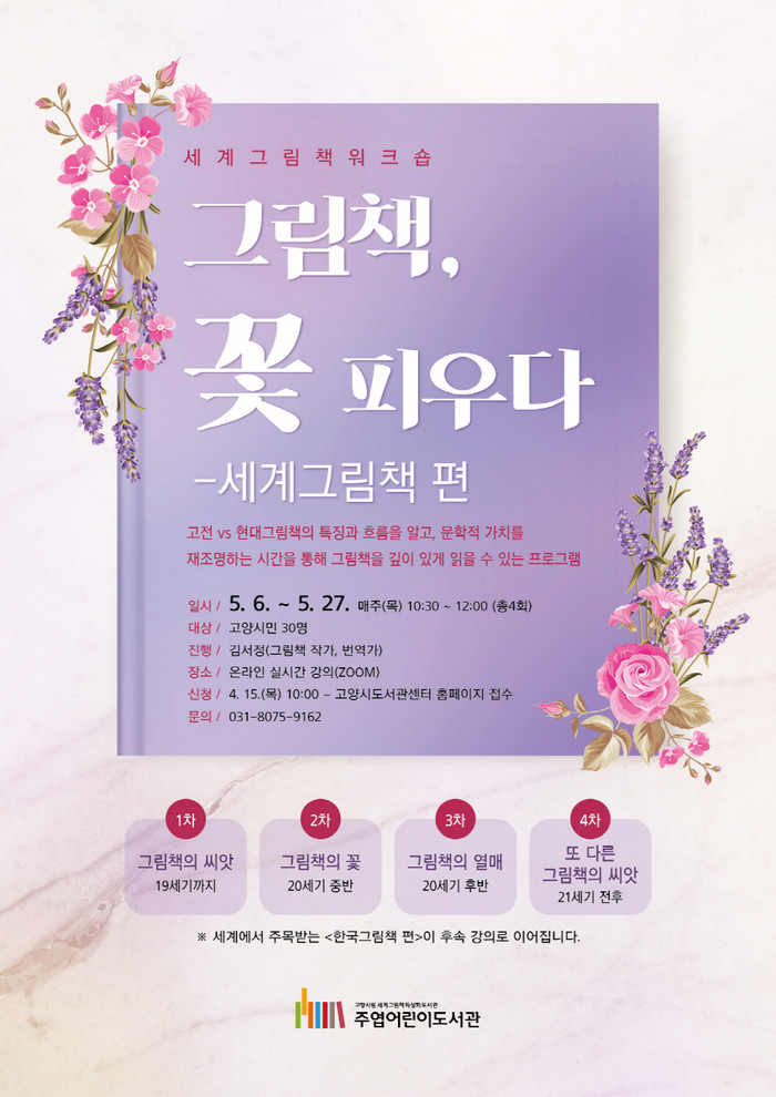 [부자동네타임즈 김인수기자] 고양시 주엽어린이도서관은 오는 5월부터 세계그림책 워크숍‘그림책, 꽃피우다 – 세계그림책 편’을 운영한다.