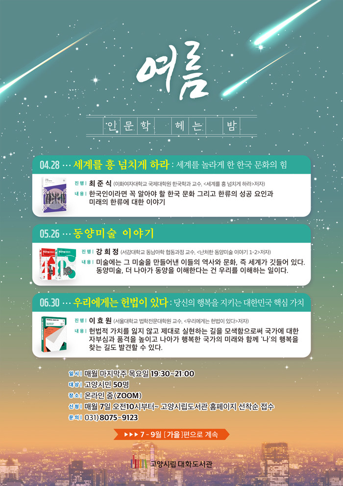 프로그램은 매월 마지막 주 목요일 저녁 7시 30분부터 9시까지 1시간 30분 동안 진행된다. 참여 신청은 오는 4월 7일 (목) 오전 10시부터 고양시립도서관 홈페이지에서 할 수 있다. 기타 궁금한 사항은 대화도서관 독서문화프로그램 담당자에게 문의하면 된다.