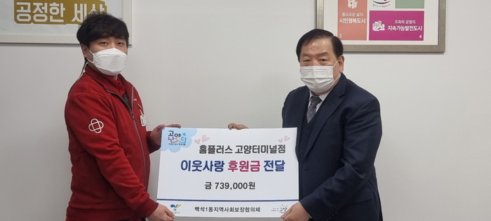 이날 기탁된 후원금 739,000원은 홈플러스 고양터미널점 내에 설치된 기부함에 고객들이 동전 등을 기부하여 마련된 것이다. 후원금은 백석1동지역사회보장협의체를 통해 지역 내 저소득층 복지사업에 사용될 예정이다.