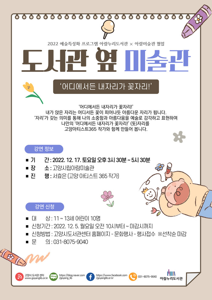 [부자동네타임즈 김인수기자] 고양특례시(시장 이동환) 아람누리도서관은 아람미술관과의 협업 프로그램 도서관 옆 미술관을 오는 12월 17일(토) 진행한다.