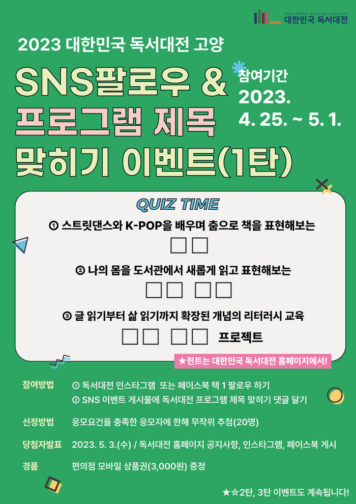 [부자동네타임즈 김인수기자] 고양특례시(시장 이동환)는 2023 대한민국 독서대전 개최를 기념해 다양한 독서 문화 프로그램을 실시하고 있다. 이번에는 프로그램 참여를 독려하고 독서대전을 널리 알리기 위해 오는 4월 25일부터 독서대전 프로그램 제목 맞히기’ 이벤트를 진행한다.
