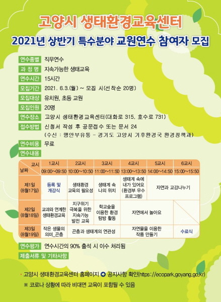 [부자동네타임즈 김인수기자] 고양시 생태환경교육센터 2021년 상반기 생태교육 교원연수 참여 교사를 오는 7월 31일까지 모집한다.