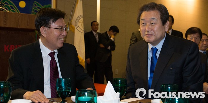 | △ 30일 서울 영등포구 중소기업중앙회에서 열린 '2015 민주화추진협의회 송년회'에서 김무성 새누리당 대표와 김덕룡 전 새누리당 의원이 대화를 나누고 있다. <사진제공=포커스뉴스> |