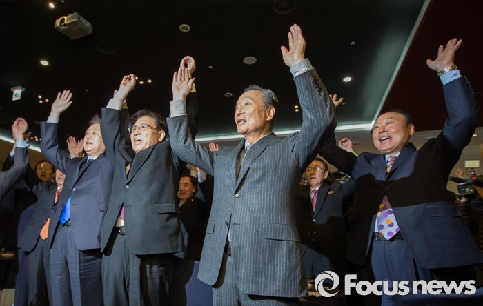 | △ 30일 오후 김영삼 전 대통령의 상도동계와 김대중 전 대통령의 동교동계가 함께 설립한 민주화추진협의회(민추협)가 서울 여의도 중소기업 중앙회에서 송년회를 가졌다. 김무성(왼쪽 부터) 한나라당 대표, 김덕룡, 권노갑 공동이사장, 박광태 전 광주시장이 만세 삼창을 하고 있다. <사진제공=포커스뉴스> |