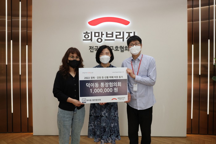통장협의회는 경북‧강원 산불피해 지원을 위해 회원들이 한마음으로 모은 1,000,000원의 성금을 재해구호협회에 기탁했다. 성금은 이재민 지원, 산불 피해 복구에 사용된다.