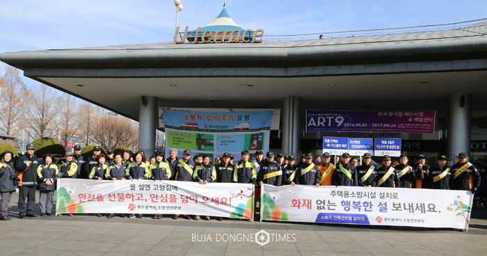 광주광역시 소방안전본부는 설을 맞아 26일 서구 광천동 유스퀘어 광장에서 소방안전본부, 한국전기안전공사 광주전남지역본부, 한국가스안전공사 광주전남본부, 5개 소방서 등 13개 기관에서 150여 명이 참가해 '설 명정, 주택용소방시설 선물하기' 캠페인을 펼쳤다.