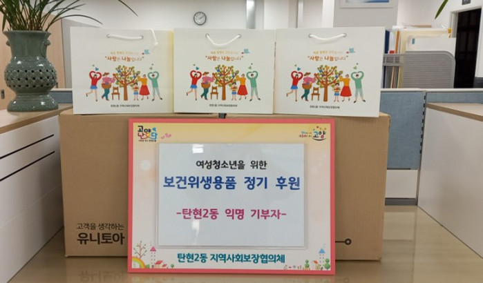 [부자동네타임즈 김인수기자] 고양시 일산서구 탄현2동 행정복지센터(동장 이종신)는 지난 22일 익명의 기부자가 행정복지센터를 방문해 저소득 여성청소년에 전달해 달라며 여성용품 12팩씩을 매달 기부하기로 했다고 밝혔다.