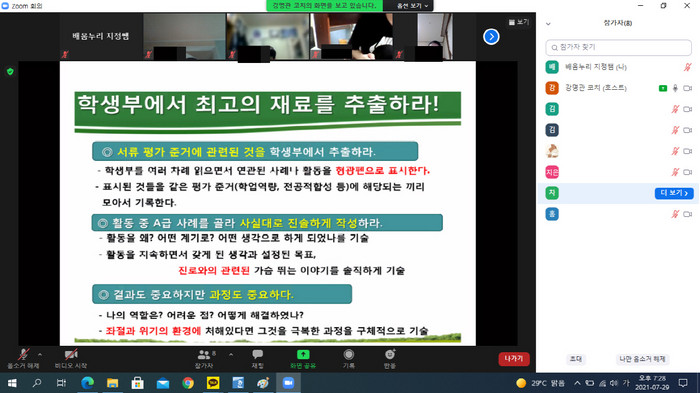 참여 학생은 “코로나19로 수험생활이 힘들었는데 2022년 입시 전형까지 바뀌어서 어떻게 준비해야 할지 막막했다. 이번 자기소개서 코칭을 통해 내가 원하는 정보를 찾아서 적용하는 법을 알게 됐다”고 말했다.