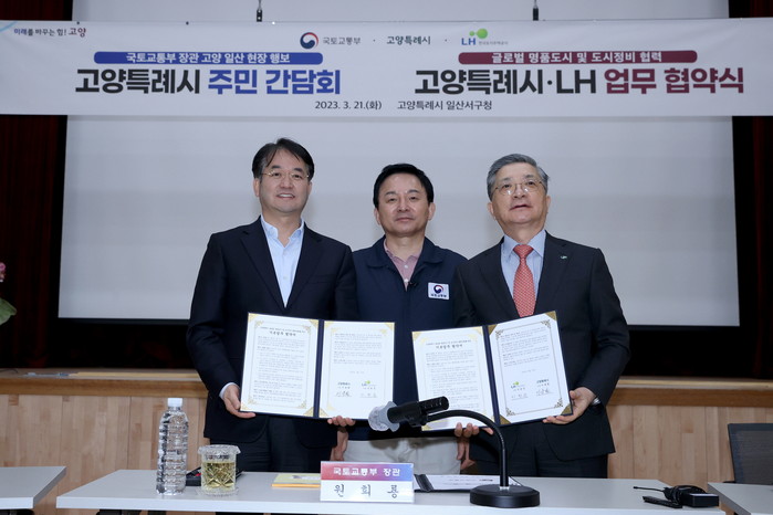 [부자동네타임즈 김인수기자] 고양특례시(시장 이동환)와 한국토지주택공사(LH, 사장 이한준)가 21일 글로벌 명품도시 조성 및 도시정비 방안 등을 협력하기 위한 업무협약을 체결했다