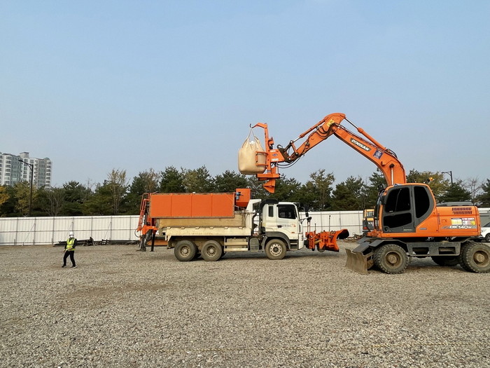 [사진설명] 도로제설 발대식 진행 중 염화칼슘을 옮기는 모습.