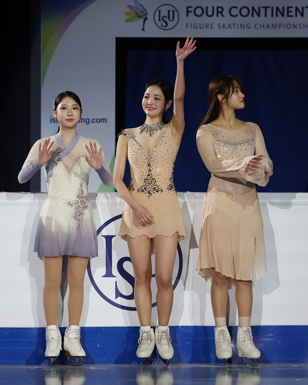 [부자동네타임즈 = 이언금 기자] 최다빈(왼쪽부터), 임은수, 위서영이 23일 서울 목동아이스링크에서 국제빙상경기연맹(ISU) 4대륙피겨선수권대회 갈라쇼에서 그룹 퍼포먼스 연기를 선보이기 전 관중에 인사하고 있다. 2025.2.23