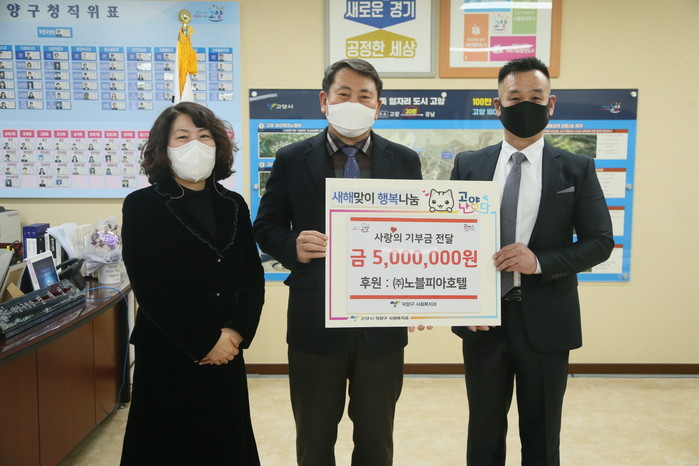[부자동네타임즈 김인수기자] 고양시 덕양구(구청장 명재성)는 지난 4일, 새해를 맞아 ㈜노블피아호텔(대표 김유수)이 저소득 가정을 위한 새해 첫 성금 500만원을 기부했다고 밝혔다.