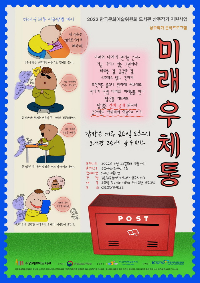 4월 환상 우체통 : 미래 우체통 편을 이후에도 5월 가정의 달 기획 프로그램, 여름방학 특강, 독서 동아리 운영 등 작가가 직접 기획한 다양한 문학 콘텐츠도 곧 만나 볼 수 있다.