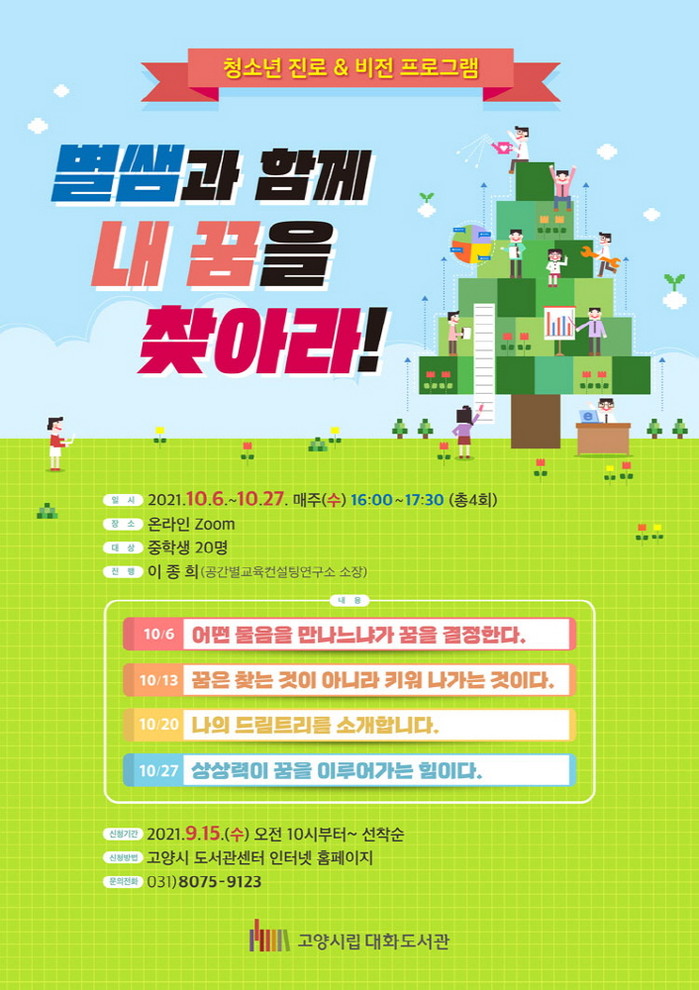 [부자동네타임즈 김인수기자] 고양시 대화도서관이 공공도서관 진로독서 프로그램 「별쌤과 함께 내 꿈을 찾아라!」를 10월 6일부터 10월 27일까지 온라인으로 운영한다.