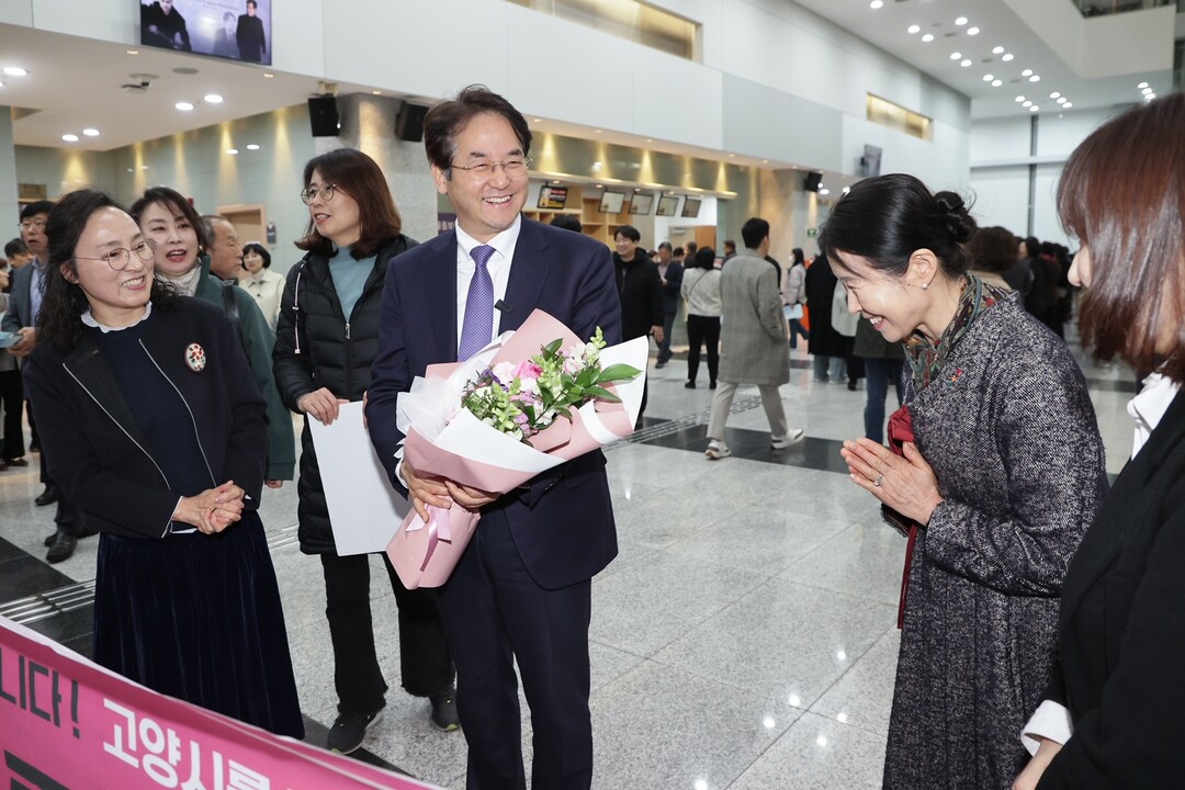 연주회가 시작되기 전 고양시 학부모·학생 등 7명은 이동환 고양시장에게‘고양시 교육발전특구 시범지역 선정’에 대한 축하와 감사를 전하기 위해 현수막과 꽃다발을 전달했다.