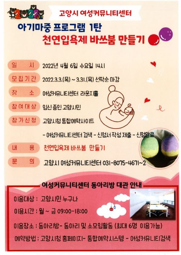 [부자동네타임즈 김인수기자] 고양시 여성커뮤니티센터(이하 센터)는 관내 임신부들을 위해 ‘아기마중 프로그램 1탄’을 4월 6일(수)에 운영한다.