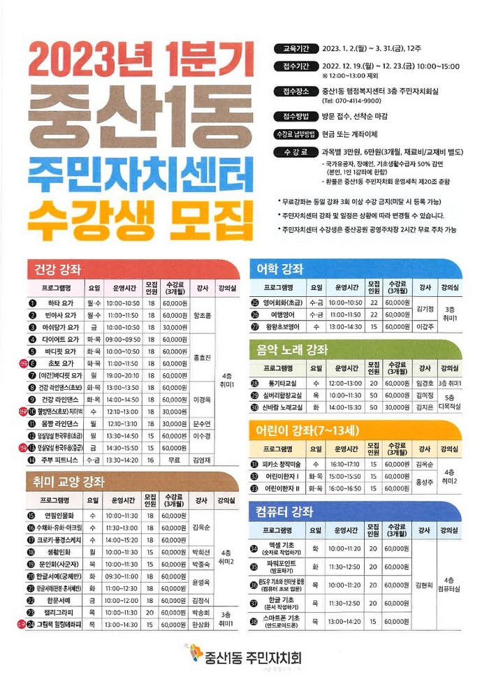 내년 1월 2일 시작되는 프로그램은 요가, 라인댄스, 한국무용 등 ▲건강 강좌 ▲취미 교양 강좌 ▲음악 노래 강좌 ▲어학 강좌 ▲컴퓨터 강좌 등 38개 강좌이다. 이번 달 19일(월)부터 23일(금), 오전 10시부터 오후 3시까지(점심시간 12시~13시 제외) 중산1동 주민자치실(동행정복지센터 3층)에서 선착순으로 접수를 받는다.