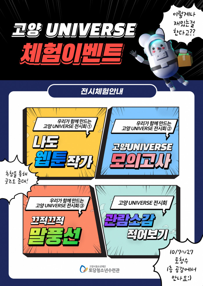 [부자동네타임즈 김인수기자] 고양시청소년재단(이사장 이동환) 토당청소년수련관은 오는 10월 7일부터 10월 28일까지 청소년 웹툰창작활동 ‘고양 UNIVERSE 작품 전시회’를 토당청소년수련관 1층 공감에서 개최한다고 밝혔다.