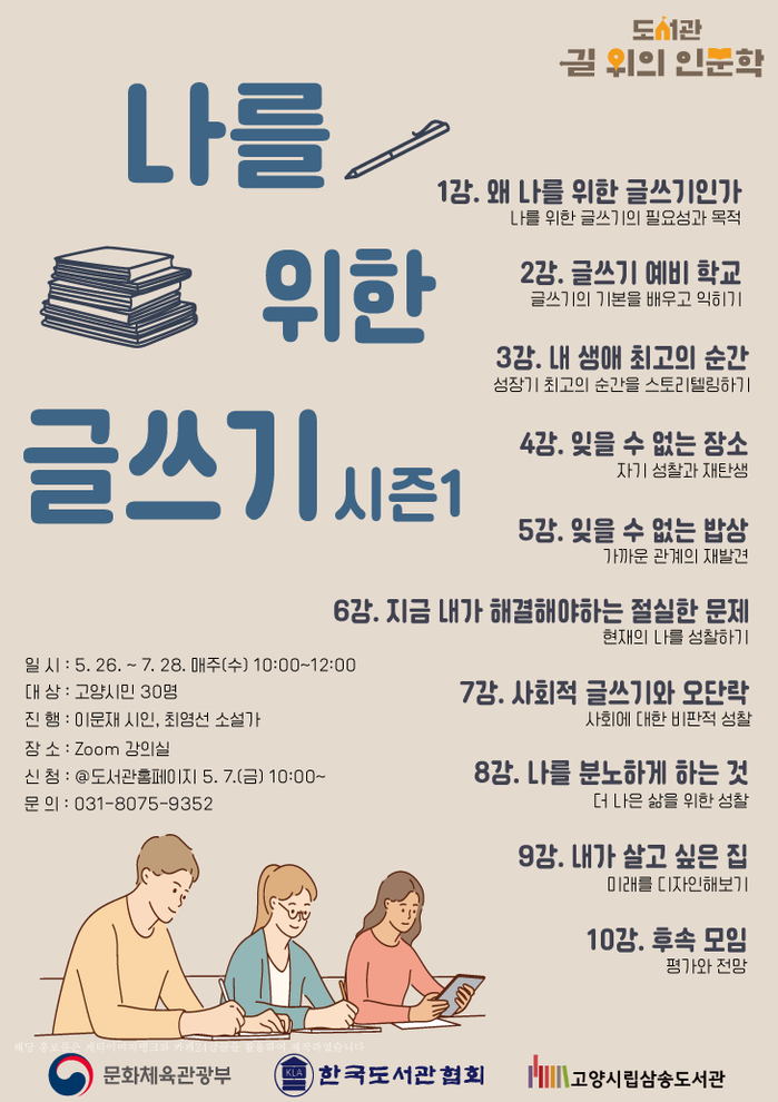 [부자동네타임즈 김인수기자] 고양시 삼송도서관에서는 오는 5월 26일부터 삶의 기억을 글쓰기로 돌아보는 ‘나를 위한 글쓰기 시즌1’을 진행한다.