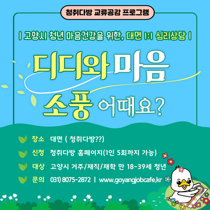 고양시는 마음건강 사각지대에 놓여있는 청년들을 위해 심리상담을 확대 운영할 계획이다. 자세한 내용은 청취다방 홈페이지 및 고양시 청취다방(☎031-8075-2870)에서 확인할 수 있다.