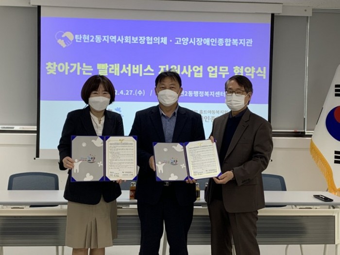 이날 협약식에는 탄현2동지역사회보장협의체 공동위원장 이종신, 박병일과 신혜용 고양시장애인종합복지관장이 참석해 협약서에 서명을 하며 본격적인 사업 시작을 알렸다.