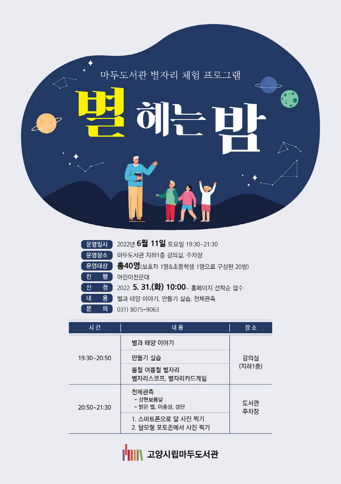 도서관 관계자는 “오랜만에 야외에서 즐기는 야간 프로그램을 마련했다”며 “마두도서관에서 초여름 밤, 가족과 함께 밤하늘을 보고 즐거운 추억을 남기는 기회가 되었으면 좋겠다”라고 밝혔다.